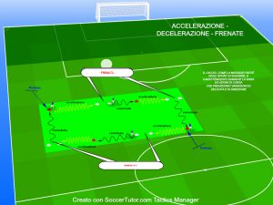 Possiamo dire che la decelerazione o frenata è una conseguenza (accelerazione) della situazione di gara per ogni calciatore, un esempio di queste corse in gara, è; andare in pressione velocemente sull’avversario con palla (accelerazione di pochi metri) eventuale duello di uno contro uno (decelerazione, distanza di sicurezza), l’avversario, effettua il dribbling, e cambio direzione o tenta lo superamento (il difensore, effettua una frenata un cambio di direzione e inizia un possibile nuovo accelerazione).