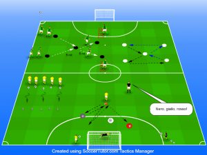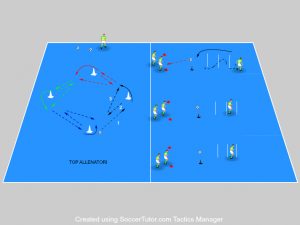 Il riscaldamento iniziale di 7 minuti con tutta la rosa, prevede una attivazione di andature varie, poi successivamente la squadra viene divisa per due gruppi, continuando la fase di “Warm-Up” , facendoli effettuare due esercizi, a rotazione con la palla. Come mostra l’immagine sotto, l’esercitazione a sinistra richiama una collaborazione (tattica semplice) tra compagni, utilizzando la combinazione “Uno-due” e chiusura triangolazione; formando un rombo con quattro birilli, i giocatori si dispongono, due per ogni birillo. Il giocatore con palla inizia l’esercizio con un passaggio verso il compagno alla stazione accanto, dove effettuando un Uno-due applica questa combinazione in senso orario poi anti orario. L’altra esercizio a destra, attiva il controllo di palla più la differenziazione motoria , che prevede: 1) una conduzione breve di alcuni metri (lascia la sfera) per poi effettuare uno slalom, ritornare verso la palla e calciarlo verso il prossimo compagno, che idem effettua lo stesso, 2) conduzione breve, corsa tra i paletti e al ritorno richiede un, “uno-due ” con il compagno in fila, il quale al terzo passaggi va in conduzione, e cosi completa l’esercizio.