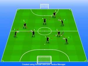 A rotazione, il giocatore “L” (in modalità skip sul posto) esegue un lavoro tecnico per 30″, grazie ai compagni, ognuno con una palla “P1” e “P2” in sincronizzazione (lanciano con le mani): appena P1 lancia la palla verso il compagno L, (altezza baciano e che a sua volta con l’interno destro indirizza la sfera verso P2) P2 invia la sua sfera con le mani verso P1, con una certa velocità per trenta secondi questa rotazione/sincronismo i giocatori “L” sarà impegnati nel gesto tecnico.