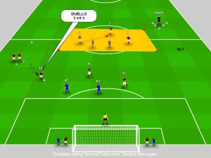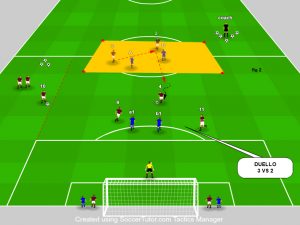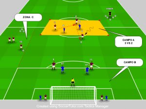 Aver un’esercizio che addestra e simula le reali situazioni di gara, che coinvolge tutta la squadra, con un gioco situazionali, ci permette (noi allenatori), di allenare sia la fase di superiorità, che l’inferiorità numerica ai nostri ragazzi. L’immagine di sotto mostra le disposizioni dell’esercizio. Un campo A, dove inizia l’esercizio con un 3 c 2 a centrocampo, dove il “Team” in superiorità numerica, dopo 4 passaggi consecutivi, possono verticalizzare, mentre i 2 difensori cercano di intercettare il pallone o le linee di passaggi.