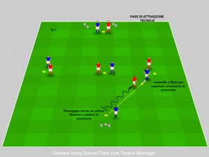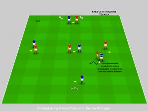 Il giocatore rosso viene superato con una finta o con un dribbling dettato dal mister.