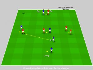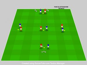 Il riscaldamento fase iniziale della seduta per i giocatori, oggi presentiamo l’attivazione del Mister Fausto Bello, che utilizza spesso questo esercizio all’inizio del campionato, un “warm up” diciamo tecnico/tattico con l’utilizzo della palla. L’immagine sotto, ci mostra, un rombo (creato da 5 cinesini gialli) con due giocatore (blu e rosso) per ogni cinesino. Le distanze tra i cinesini sono a vostra scelta in base al livello o categoria in questione.