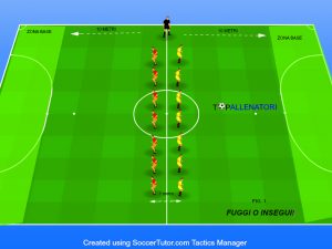 “Fuggi o insegui” è il nome del gioco, dove si crea due squadre (rosso e giallo), e sono disposti in riga, come mostra l’immagine, i ragazzi sono  fermi sul posto, inattesa di un segnale (vocale), dato dall’istruttore. Ogni squadra ha di fronte una base di ricovero a circa dieci metri chiamata “Zona Base”, l’obiettivo del gioco è arrivare alla base senza essere toccati dalla squadra avversaria.