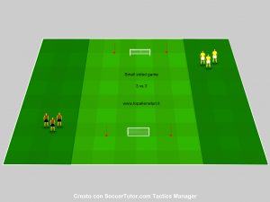 In un campo o in due campetti adiacenti di forma rettangolare (lato lungo 15mt, lato corto 8mt) si gioco un tre contro tre, e ad ogni estremità viene posizionato una mini porta. L’obiettivo tecnico – tattico richiesto dall’istruttore è la ricerca di collaborazione a terno sia in fase di possesso che in fase di non possesso, e da queste richieste, nascono automatismi primordiali, ossia, i principi tattiche offensivi, rapide azioni – triangolazioni -passaggi corto, corto lungo, dribbling e finte: mentre la tattica del riconquista si azionano, marcature a uomo, contrasti,, raddoppi di marcature e difesa della porta.