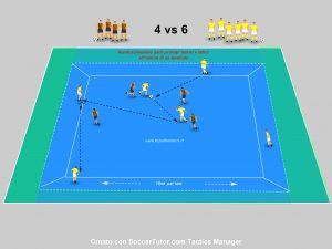 Un campo (Quadrato) che misura dieci metri per lato, all’interno del quadrato la squadra Arancione ha l’obbiettivo di intercettare più palloni in un tempo massimo di 3′, mentre la squadra Gialla, gioca per il mantenimento del possesso, con quattro calciatori esternamente per lato e due giocatori all’interno del quadrato. Si chiede ai ragazzi (squadra gialla) di effettuare solo passaggi rasoterra, con massimo tre tocchi (se sono a un livello avanzato anche due tocchi), questo gioco, gli addestra ai principi della circolazione/collaborazione rapida in spazi ridotte in superiorità numerica temporale, utilizzando le proprie tecniche individuali con un vincolo di spazio e tocchi. L’obiettivo tattico per chi cerca di intercettare la sfera è un principio di pressione o pressing o ADDESTRARE  al blocco dei passaggi. A rotazione si invertono i ruoli.