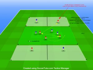 In questo articolo mostrammo un’esercitazione specifica per la verticalizzazione. Un esercitazione di base (un primo step), che può essere inserito per tutte le categorie agonistiche. Il gioco utilizza 10 calciatori (si può creare due spazi uguali avendo 20 calciatori), si prepara un campo con misure 40×20 (le misure sono personali e intercambiabili), suddivise in tre settori come mostra l’immagine, si gioca un 3 contro 3 nel settore centrale, due squadre (blu e Rosso) che si contengono il possesso palla con l’obiettivo di far arrivare la sfera nella zona franca attraverso passaggi tra le linee, viceversa la squadra in non possesso, effettua una tattica di blocco chiusura, e ripartenza. Alle due estremità del campo, sono posti e suddivisi in due zone diverse due giocatori di ogni squadra, come illustra l’esempio sotto, la squadra rossa, ha trovato il passaggio in verticale per il compagno di fronte e si guadagno un punto.