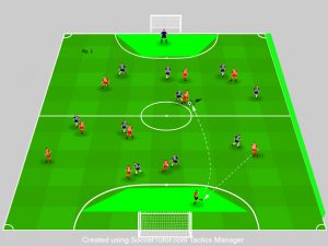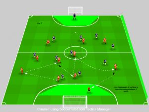 Partita 10>10 campo 50×65 diviso a metà. Prima di andare in zona offensiva bisogna fare 5 passaggi, il gol è valido se tutti sono su dalla metà campo.