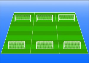 Nella figura sotto, abbiamo inserito tre zone di lavoro per questo esercizio da proporre durante gli allenamenti. Da notare che questo esercizio è adattabile per tutte le categorie, dalla scuola calcio ai più grandi.