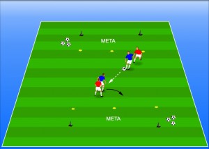 In un rettangolo di m 20 x 10 (le misure sono sempre indicativi) si esercitano due attaccanti Blu e due difensori Rossi. Da entrambi i lati abbiamo inserito una zona meta, in cui è l’obbiettivo da raggiungere per chi attacca. In questa prima fase di addestramento si chiede ai difensori di essere semi attivi. L’esercizio inizia con un passaggio rasoterra di un compagno Blu verso l’altro compagno posto di fronte a otto metri, la quale, con la pressione del difensore, attua una protezione (difende palla con il corpo). A questo punto dell’esercizio, l’attaccante cerca (si addestra) a superare il difensore utilizzando diverse tecniche individuale per arrivare a meta, senza uscire dal campo disegnato. Nel momento in qui un attaccante non riesce a superare l’avversario, può rigiocare la sfera indietro al compagno.