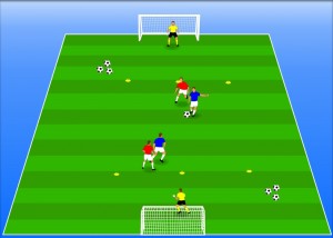 In questa fase successiva, abbiamo inserito due portieri; l’attaccante completa l’azione offensiva di superamento con il tiro in porta. Il difensore Rossi è attivo al cento per cento nel duello. L’esercizio racchiude una reale situazione di gioco.