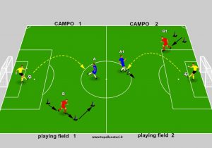 Invece nel campo 2 il difensore rosso, parte appena la sfera viene calciato dal portiere, senza percorrere un percorso, dando meno tempo e spazio al possessore, affrontandolo in un duello quasi frontale  di 1v1.