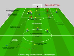 Nell’immagine proposta, l’esercizio mostra una situazione di calcio di punizione laterale al “Box”, fornendo tre soluzioni probabili per i calciatori. Dipende sempre dal inganno che si crea e se l’avversario ci permette di acquistare spazio e tempo per finalizzare. La riuscita di qualsiasi palla inattiva, e frutto di un continuo esercitare/sincronizzare durante le sedute di allenamento. Da sempre, e forse oggi in modo ancora più marcato, nell’evoluzione del gioco del calcio, le palle inattive hanno rappresentano una soluzione spesso determinante per raggiungere l’obiettivo della fase di gioco interessata; obiettivo che, per la fase di possesso palla è quello di segnare!! Per approfondire soluzioni tattiche per la tua squadra, il portale www.topallenatori.it ha creato un ebook (in formato PDF) per voi allenatori. Un ebook che illustra e spiega con immagini di riferimento probabili soluzioni da allenare per le palle inattive.