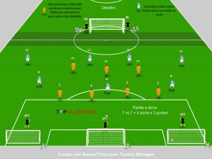 In linea generale le partite a tema o gioco a tema, nel gergo calcistica, s’intende un confronto tra due squadre, rispettando un vincolo, una limitazione o raggiungere un obiettivo. Le partite “a tema” sono legati alla tematica principale della seduta d’allenamento, e inserito come collaudo di riscontro , rappresentando un ottimo strumento di valutazione per il mister, e di prima verifica per i calciatori. In somma possiamo dire che le partite “a tema” sono uno strumento utile all’allenatore per testare il gruppo sul perseguimento dell’obiettivo da mettere in risalto, ma anche per provare schemi da applicare durante le gare ufficiali. Diversamente ma utile nei mesi invernali le partite “a tema” vengono introdotto all’inizio della seduta sotto forma di riscaldamento, con lo scopo principale di innalzare la temperatura corporea. L’articolo di oggi mette in risalto l’esercitazione\partita a tema di fine settimana, dove i calciatori si addestrano al modulo di gioco e al pensiero tattico collettivo a confronto.
