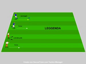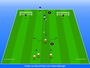 Il gioco inizia quando (la squadra blu) il bambino-ragazzo calcia la sfera verso l’avversario/attaccante, e immediatamente inizia la sua corsa di avvicinamento con l’obbiettivo di riacquistare il pallone. Il ricevente,, dopo aver controllato la sfera ha due obiettivi: superare il suo diretto difensore in dribbling e scegliere in quale porta calciare per segnare.