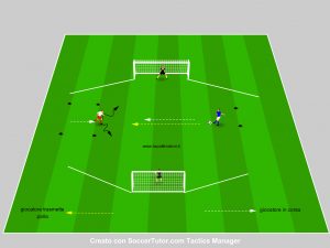 I due duellanti sono distanti a pochi metri, e in questo esercizio le porte sono disposte lateralmente, uno di fronte all’altra a una distanza di dieci metri. Il “Via” avviene sempre con la trasmissione della sfera verso l’attaccante in maglia bianca, il difensore accorcia le distanze e attende la mossa del suo avversario, l’attaccante nel attimo in cui riceve palla, deve decidere  in quale porta attaccare o fintare.
