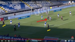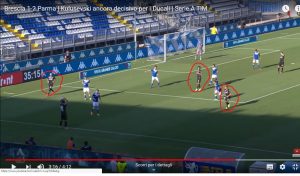 Riguardando gli highlights della partita, ma in particolare, la rimessa laterale che ha regalato i tre punti al Parma, si intuisce che il mister D’aversa lavora molto sulle palle inattive. Con due movimenti d’inganno il Parma ha distratto la difesa del Brescia, e ha segnato un goal stupendo.