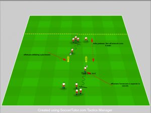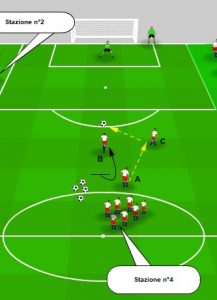 Si conclude la preparazione riscaldamento pre – gara con l’esercizio di tiro in porta. Ad ogni tiro in porta, sono impegnati tre giocatori (come da figura sotto) A – B – C: Appena “B” effettua un contro movimento, “A” trasmette palla verso “C”, “C” di conseguenza chiude il triangolo con “B” che va alla conclusione.