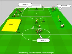 All’interno della stazione n°1, i 10 componenti iniziano in modalità blanda (con tre palloni), trasmetto ad un compagno libero e mi sposto (corsa continua e orientamento per ricevere eventuale passaggio). Chi riceve palla, inizia con diversi controlli orientati: