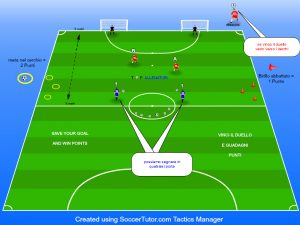 Abbiamo estratto due giochi dai nostri ebook’s che riguardano l’attività di base, gli addestramenti base con l’inserimento del ludico. In questi due esercitazioni oltre all’obiettivo tecnico individuale ricercato con il gioco, si possono sommare altre capacità che automaticamente interagiscono con lo svolgimento del gioco. Gli strumenti del gioco nella scuola calcio sono tanto più efficaci quanto più sono semplici e scarsamente strutturati. Pertanto oggetti semplici come palle, palline, mini porte birilli di diverse colori, paletti sono notevolmente più adeguati e utili nel costruire dei giochi e, quindi, nell’aiutare lo sviluppo del bambino, rispetto a strumenti complessi e sofisticati.