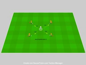 I giocatori gialli, posizionati sui 4 vertici del quadrato in possesso palla devono scambiarsi il posto in