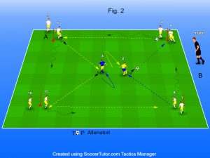 Nella figura 2, possiamo vedere gli sviluppi del gioco; quando la sfera arriva nelle stazioni (A) o (B), i calciatori che ricevono palla, trasmettono sempre al centrocampista di riferimento al centro del gioco, la quale effettua un controllo orientato per servire un compagno al vertice opposta.