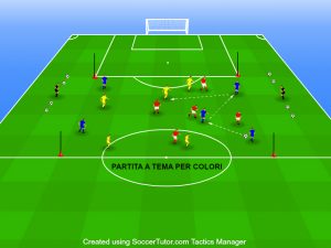 La seconda è ultima fase del riscaldamento viene svolto con l’utilizzo della palla, creando un quadrato che misura 30 metri per lato, si formano tre squadre di colori diverse: Blu, Giallo e rosso di uguale numero. Si gioca la partita a tre colori, due colori in possesso mentre un colore deve recuperare palla. L’obiettivo per “chi sta sotto”, e di effettuare un pressing e chiusure dei passaggi per rientrare in possesso palla. Il vincolo per i due colori in possesso è: non effettuare lanci e massimo due tocchi. 2 minuti di lavoro per ogni colore che deve recuperare palla, poi a rotazione tocca ad un’altra squadra. Tempo 12 minuti
