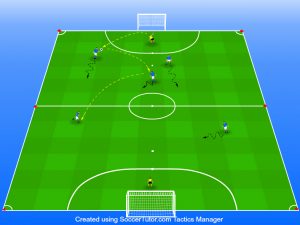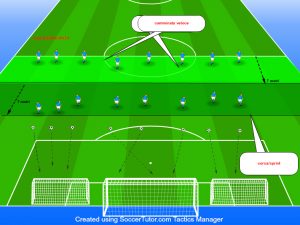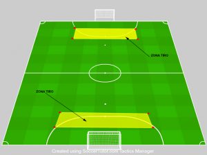 Partita 5:5, 6:6, raggiungi la zona tiro per calciare in porta, si richiede alle due squadre, nel momento che un giocatore riceve palla (fase offensiva) all’interno della zona tiro, ha l’obbligo di calciare in porta.
