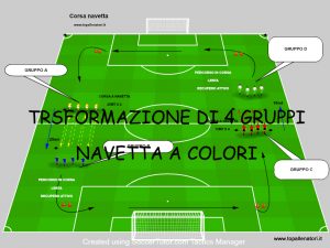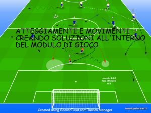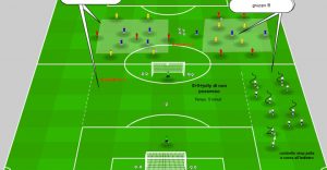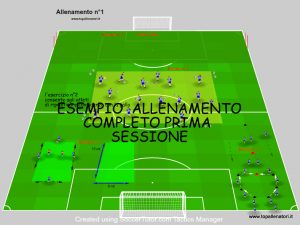 Pre – atteggiamenti, movimenti nella costruzione del gioco all’interno del proprio sistema. Schierando sul campo i reparti, partendo dal giro palla della difesa, si inizia l’addestramento, attivando sincronizzazioni e movimenti in base alla posizione del campo e della palla.