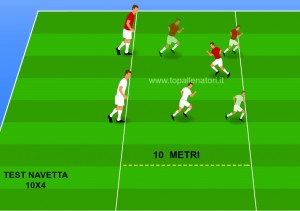 L’atleta percorre in andata e ritorno, per quattro volte, la distanza di dieci metri passando sia in andata che al ritorno, dietro ad un ritto. Il tempo si calcola partendo sempre dal movimento dello stacco del piede posteriore. Per garantire che il test venga compiuto correttamente e per la perfetta rilevazione dei tempi, è necessario che la linea dei 20 mt sia effettivamente toccata con il piede prima di invertire la direzione di corsa.